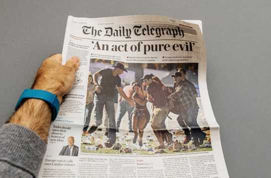 The Daily Telegraph front page of the shootings in Las Vegas on Oct 1, 2017. Hadrian/Shutterstock.com