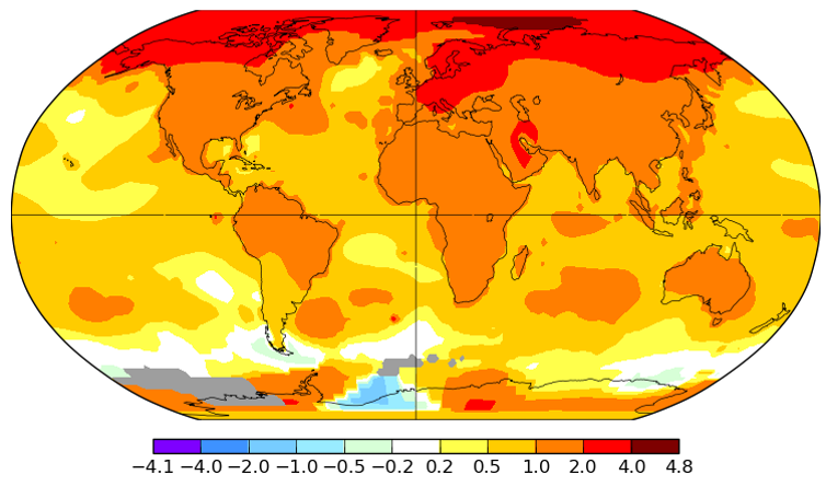 Arctic temperatures have been rising faster than the global average. This map shows the average change in degrees Celsius from 1960 to 2019. NASA-GISS